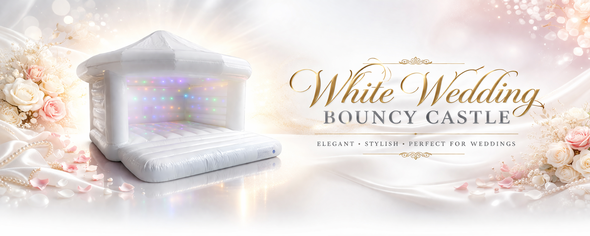 One of the biggest trends in wedding entertainment right now is the white wedding bouncy castle.
